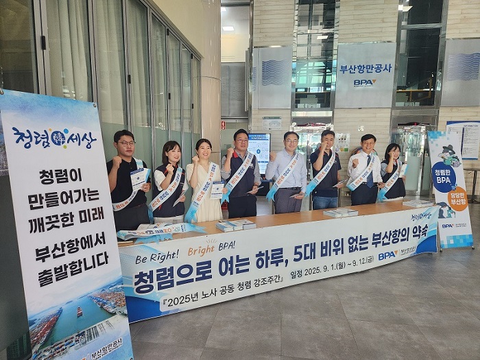 (사진 출처 : 부산항만공사) - 청렴 강조주간을 맞아 노사 공동 청렴문화 확산 활동 전개 부산항만공사(BPA, 사장 송상근)는 3일 오전, 부산항만공사 노동조합(위원장 박신호)과 함께 출근길 청렴 캠페인을 개최했다고 밝혔다. 이번 캠페인은 청렴을 조직문화의 핵심 가치로 인식하고 실천을 강조하기 위해 마련되었다. 출근길에 나선 임직원들은 청렴 실천의 의미를 되새기며 특히 송상근 사장이 부임 이후 꾸준히 강조해온 5대 비위* 근절 의지를 다지는 시간을 가졌다. * 5대 비위 : 갑질, 성비위, 직장 내 괴롭힘, 음주운전, 금품수수 BPA는 지난 1일부터 진행하고 있는 노사 공동 청렴 강조주간을 계기로 청렴 캠페인 외에도 ▲나만의 청렴정원 만들기 ▲5대 비위 예방교육 ▲찾아가는 상담센터 등 다양한 참여형 청렴 프로그램을 추진할 계획이다. BPA 송상근 사장은 "청렴은 모든 임직원이 자발적으로 참여하여 매일의 실천을 통해 완성되는 가치"라며, "이번 청렴 강조주간과 캠페인을 통해 청렴을 조직문화의 뿌리로 확고히 하고 특히, 5대 비위를 철저히 예방하여 국민 신뢰에 부응하는 청렴 모범 공공기관이 되겠다"라고 말했다. 부산항만공사 2025년 9월 3일 보도자료 바로가기