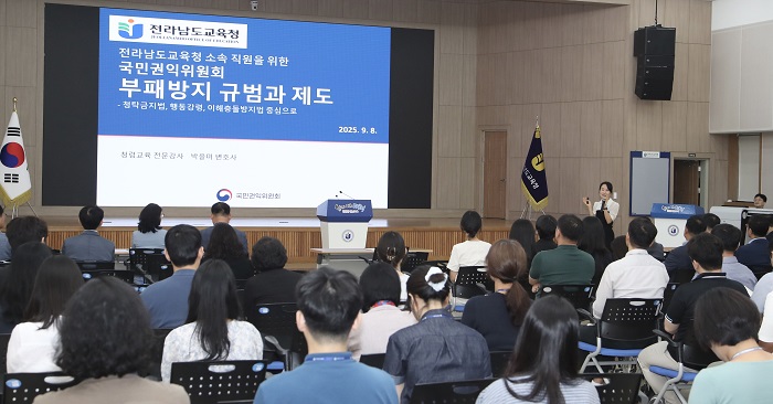 (사진 출처 : 전라남도교육청) - ‘갑질 근절·하이파이브 실천수칙’ 서약식 및 청렴교육 실시 전라남도교육청(교육감 김대중)은 9월 8일 본청 대회의실에서 ‘갑질 근절과 하이파이브 실천수칙 준수 서약식’을 갖고, 청렴한 조직문화 조성을 다짐했다. 서약식에는 교육감을 비롯해 국장급 간부와 본청 전 직원이 참여했으며, 문태홍 정책국장이 대표로 서약서를 낭독했다. 문 국장은 “건전한 직장 분위기를 조성하고, 서로를 존중하는 건강한 조직문화를 만드는 데 앞장서겠다”고 다짐했다. 이날 직원들은 관리자와 담당자가 지켜야 할 하이파이브 실천 수칙을 준수하고, 공정하고 책임있는 직무수행을 하며, 부정청탁 및 사적이익 추구를 하지 않겠다는 다짐을 했다. 서약서에는 ▲ 공정한 직무수행 ▲ 사적인 일 지시 금지 ▲ 근무시간 외 업무지시 금지 ▲ 모임 강요 금지 ▲ 비인격적 대우 금지 ▲ 상호 존중하는 직장 분위기 조성 ▲ 공정하고 투명한 직무수행 ▲ 부정청탁 금지 ▲ 직위 이용 부당이득 금지 ▲ 청렴한 조직문화 조성 등 공직자가 지켜야할 핵심 원칙이 담겼다. 서약식에 이어 국민권익위원회 청렴강사인 박을미 변호사가 ‘갑질 근절과 조직문화 개선’을 주제로 청렴교육을 진행했다. 박 변호사는 공무원 행동강령, 이해충돌방지법, 청탁금지법 등 필수적인 반부패 법령을 실제 사례와 함께 설명하며, 현장에서 적용할 수 있는 구체적인 실천 방안을 제시했다. 김재기 감사관은 “이번 교육을 통해 직원 모두가 존중과 배려의 가치를 다시금 되새기는 계기가 되길 바란다”며 “앞으로도 꾸준한 교육과 캠페인을 통해 투명하고 신뢰받는 조직문화를 확산해 나가겠다”고 말했다. 전라남도교육청 2025년 9월 8일 보도자료 바로가기