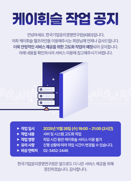 (사)한국기업윤리경영연구원(이하 "KBEI")은 고객님의 개인정보를 중요시하며, 개인정보 보호 관련 주요 법률인 「개인정보 보호법」, 「정보통신망 이용촉진 및 정보 보호」등 준수하여야 할 관련 법규상의 개인정보보호 규정을 준수하고 있습니다. KBEI는 개인정보처리방침을 통하여 고객님께서 제공하시는 개인정보가 어떠한 용도와 방식 으로 이용되고 있으며, 개인정보보호를 위해 어떠한 조치가 취해지고 있는지 안내드립니다.